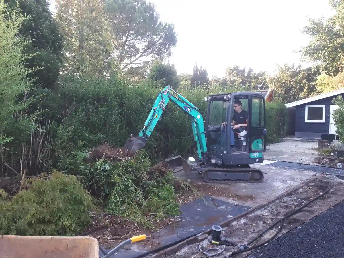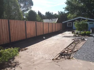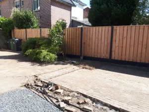 Werkzaamheden: Verwijderen van heg, plaatsing van lange douglas schutting met betonnen palen en onderzijde.