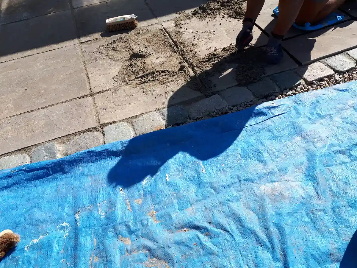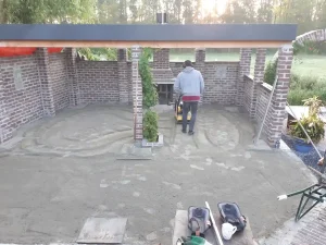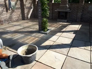 Werkzaamheden: Aanleg van natuursteen terras met voegwerk onder overkapping.